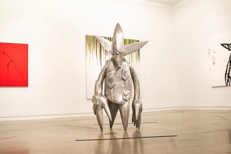 On the second floor of the exhibition, there is another seminal figure in FUTURA’s world, “FL-001 POINTMAN,” a silver rendition of the artist’s signature sculpture, which debuted in 1988. The silver robotic figure with its elongated head, oversized ears, and crustacean-inspired appendages forms a striking silhouette, slightly sinister in its expression. Sinister-looking maybe, but not enough to ostracize the figure that regularly shows up in FUTURA’s clothing designs, artworks, and even on bags.