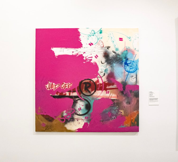 Circling back to the art; of major importance in the exhibition is “JUMP OFF”, one of the first paintings that FUTURA made in his studio on Hope Street in Brooklyn, NYC, the beginning of an actual space that would later become FUTURA LABORATORIES. Other eye-catching works include “INJECTION 2,” a bright red aerosol piece on canvas from FUTURA’s collection; “GARBAGE ROCK,” an aerosol on metal offering; and “5IX BLACK DOOR” (1981-1985), a graffiti-laced piece of art with bright symbols, drawings, and the word REVOLT boldly tagged throughout from the collection of another world-renowned artist, KAWS.