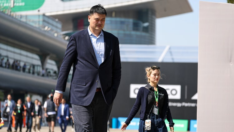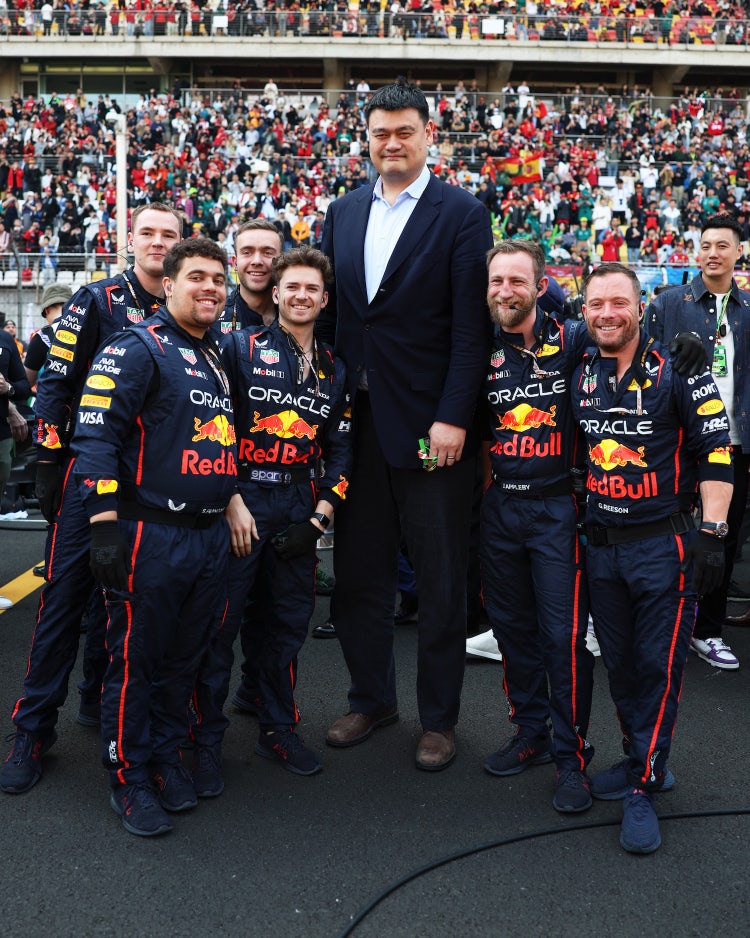 While at the F1 Grand Prix in China, Yao Ming made a Formula 1 pit crew look like the cast of Honey, I Shrunk the Engineers. At 7 feet and 6 inches, he walks through events like a moving skyscraper. One shot shows him in a sea of Red Bull crew members grinning like they’re posing with a monument. The other? Yao casually strolling through the same event like Godzilla next to a regular-sized woman.