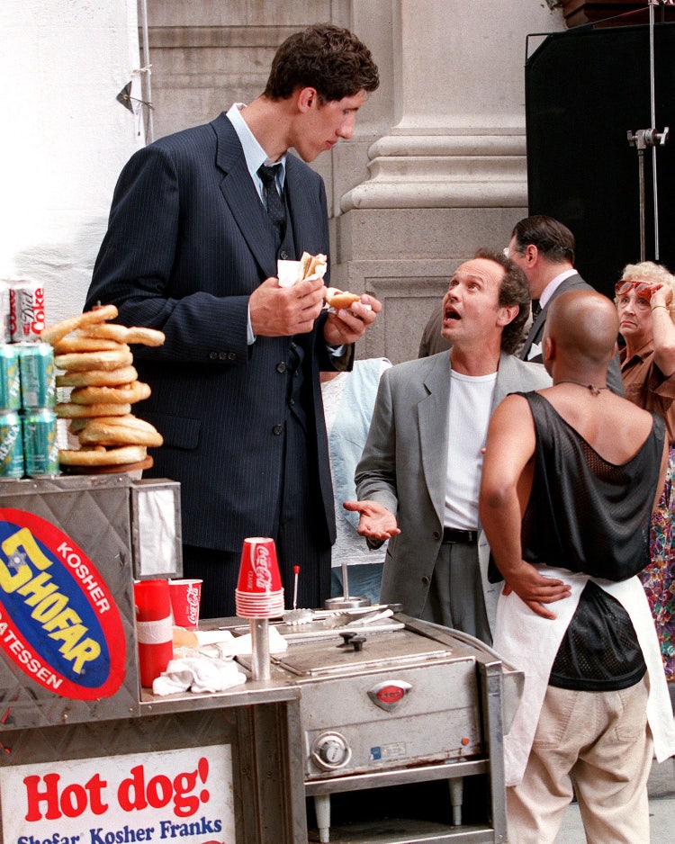 The 7-foot 7-inch Mureșan didn’t just break backboards — he broke perspective. Standing next to the 5-foot 6-inch Spike Lee and fellow NBA alum Juwan Howard (a towering figure in his own right at 6 feet 9 inches), he looks like he wandered off a comic book panel. Another photo (below) showed him sitting in a regular arena seat like it’s for a dollhouse. An arguably funnier third saw him eating a hot dog while Billy Crystal tries to process what he’s witnessing in real time.