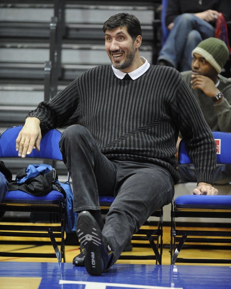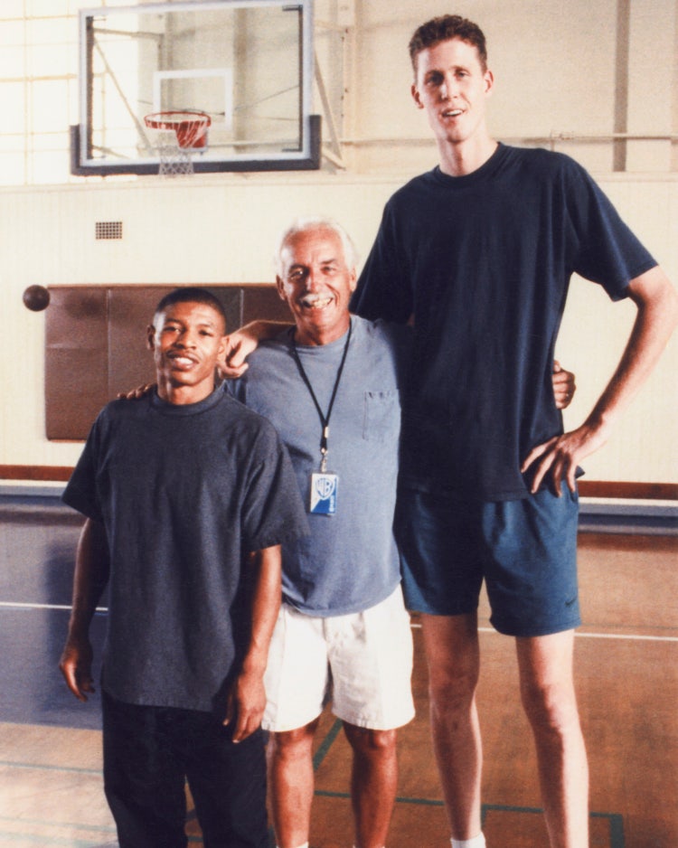 This trio might as well be labeled “Tall,” “Small,” and “Medium.” Shawn Bradley (7 feet and 6 inches) and Muggsy Bogues (5 feet and 3 inches) standing on either side of a regular-sized coach looks like a real-life height chart. It’s even funnier when you remember Bradley played one of the Monstars in Space Jam — and didn’t even need CGI to look cartoonishly huge.