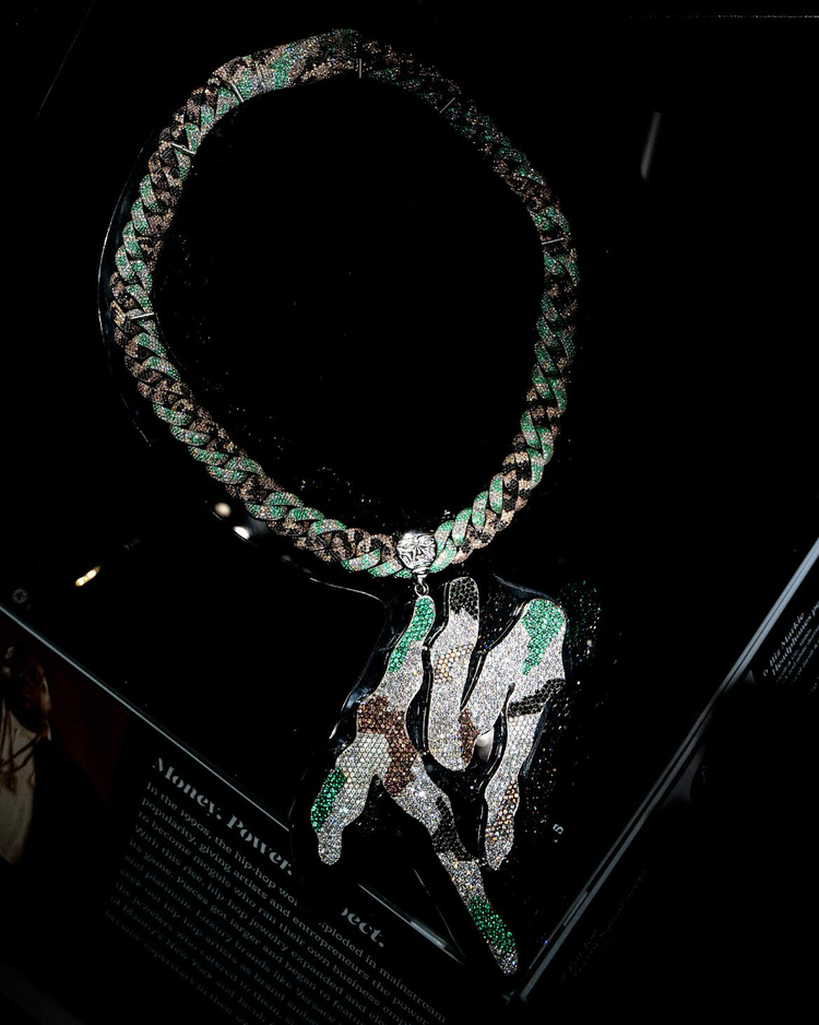 Rappers grew into businessmen and CEOs of their record labels in the late ‘90s/early 2000s, and they started designing chains that signified their crews and loyalty. Some of the iconic items in the exhibit include the Roc-A-Fella medallion, Fat Joe's oversized camouflage Terror Squad "TS" chain, and a white gold-and-diamond "QC" necklace from Kevin "Coach K" Lee, one-half of the Atlanta-based Quality Control Music.