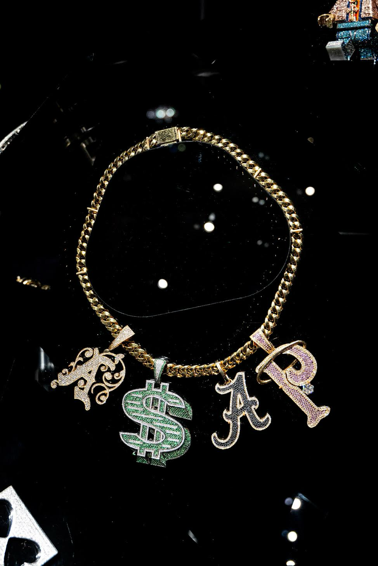 Next to it are pieces by ASAP Rocky, a younger-generation artist who is shifting Hip Hop bling in creative ways. His jewels include a white, green, purple, and blue diamond nameplate chain that spells out ASAP on a Cuban link as well as a multicolored, fully articulated LEGO minifigure pendant.