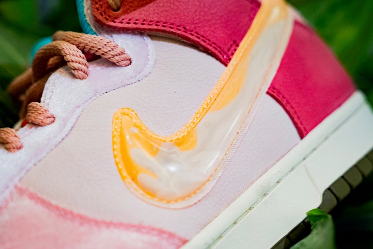 The Nike x Social Status “Free Lunch Strawberry Milk” Dunk Mid takes inspiration from the free lunch program, an initiative that is a staple in many underserved communities that supplies school kids with free meals. Aside from the community aspect, the program also encapsulates childhood memories and a certain playfulness that translates directly into the sneaker design. Its upper is a mix of soft pink hues -- reminiscent of strawberry milk -- complemented by tan and cream accents with velvety suede and smooth leather material combinations. Its standout details are its mini-Swoosh on the toe box and its unique semi-translucent and glossy Swoosh that features a cream milky finish that aligns with the strawberry milk theme and adds flair.