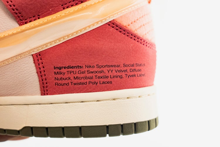 As far as branding and storytelling go, the Dunks feature dual Social Status and Nike logos on the tongue and insoles with special ingredients text on the heel counters of the sneakers displaying all the materials that they are made of. Altogether, the Dunks resonate not just for its aesthetic appeal, but also for its cultural significance. By highlighting the importance of community programs like free lunch, Nike and Social Status have created a product that goes beyond fashion by sparking conversations about social issues.