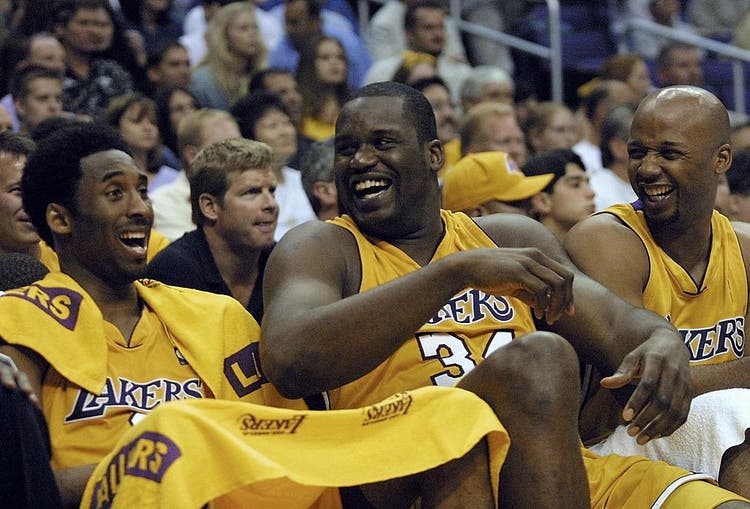 The dynamic duo of Kobe Bryant and Shaquille O’Neal struck again in May 2001 when they swept the Western Conference Finals. In this picture, they share a happy moment in the last minutes of Game 4, where they beat the San Antonio Spurs 111-82.