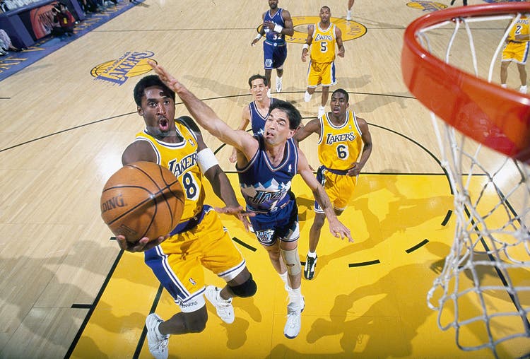 In this action shot from April 1998, Kobe drives up to the net in an intense play against the Utah Jazz’s John Stockton.