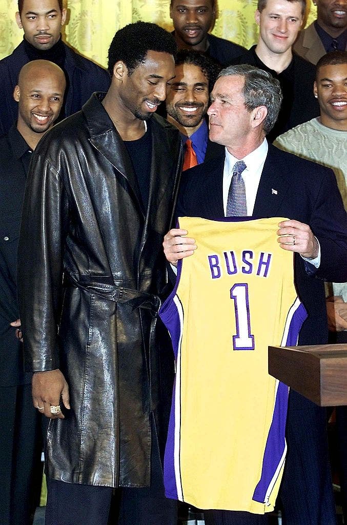 The LA Lakers were invited to the White House after becoming world champs and Kobe presented former President George W. Bush with a jersey in January 2002.