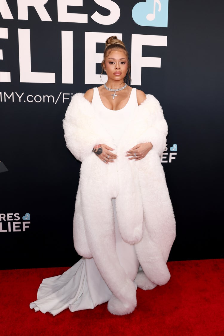Any other celebrity might have struggled to pull off head-to-toe white, but not Latto. At the 2025 Grammy Awards, she showed up in a white dress topped with a fur shawl hanging off her shoulders. While the front was stunning, the gown featured a backless design with triangle-shaped cutouts just above her hips.
