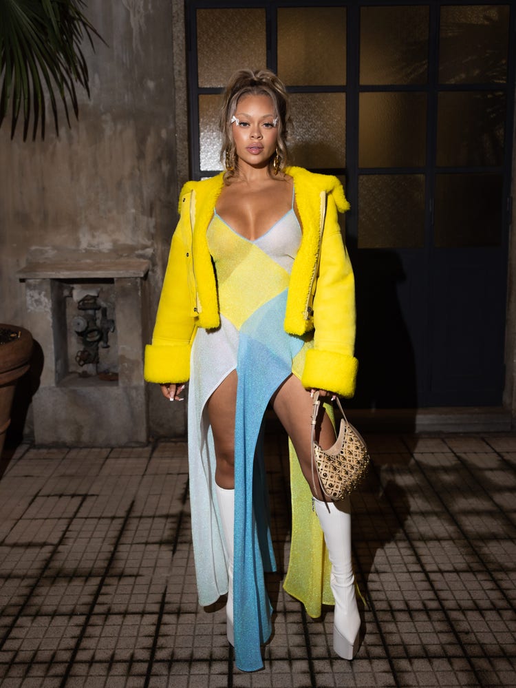 If you’ve seen Latto’s “On God” video, you already know yellow is her color. For GCDS’ Milan Fashion Week show, she wore a blue and yellow dress from the brand’s Spring/Summer 2024 collection and topped it off with a neon yellow shearling coat.