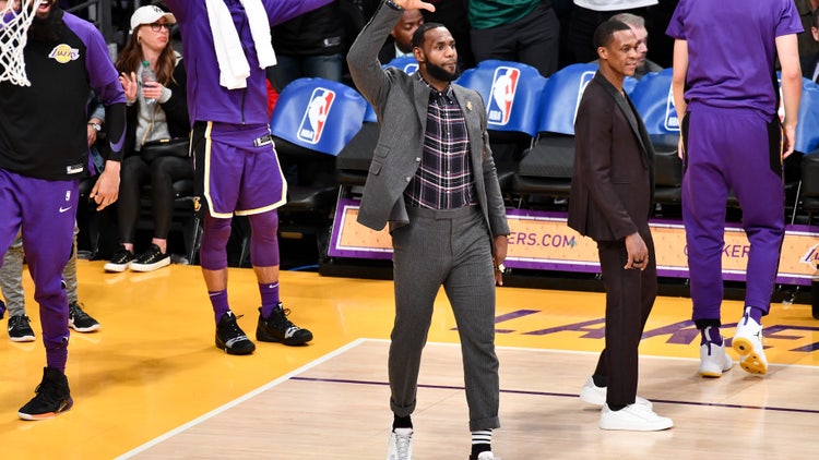 Bron brought prep-school polish to the Staples Center hardwood with a cropped grey suit layered over a buttoned plaid shirt. He punctuated the look with A-COLD-WALL x Nike Zoom Vomero +5 sneakers, black socks with white stripes and a lapel pin that subtly nodded to the occasion. The tailoring was tight and intentional — narrow shoulders, high-ankle hem and a fitted waistline that gave the whole ensemble a clean, sculpted energy. While more understated than some of his bolder looks, this outfit was a quiet flex in tailoring discipline and personal flair. It’s the kind of refined, slightly offbeat silhouette that would have harmonized beautifully with the Met Gala’s celebration of Black elegance and sharp lines.