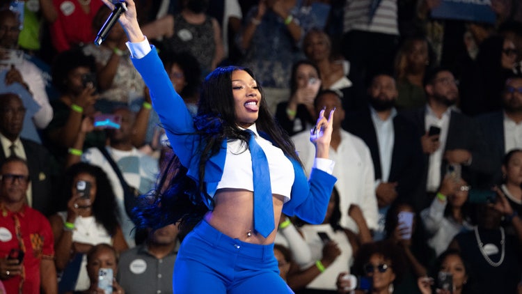 On Tuesday (July 30), Megan Thee Stallion and her crew of Hotties brought the energy to the Georgia State Convocation Center for Kamala Harris’ presidential campaign rally. Rocking a custom-fitted blue suit, the Houston native danced and performed for a packed crowd just prior to the vice president's appearance on stage.