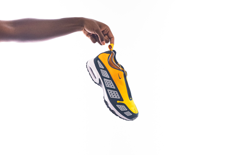 Clad in an explosive “Canyon Gold” hue, the Air Max SNDR features black overlays with reflective panels against its vibrant gold shroud atop the white midsole, one of the silhouette's defining features. Once you unzip the shroud, the numbers “6453” are revealed, referencing the last four digits of Nike’s office numbers worldwide, which also spell out Nike on a keypad. Innovation-wise, Max Air cushioning in the heel and Nike Air in the forefoot provide the signature comfort and bounce the silhouette is known for while mini Swooshes on the shroud and tongue complete its reintroduction. A lasting detail that also caught my eye is its outsole, which features intricate black and gold Braille-like patterns for a lasting walk-away impression.