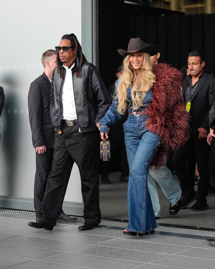 Beyoncé stayed on theme in a denim jumpsuit cinched with a Western buckle and topped with a brown cowboy hat. She then elevated it with a voluminous feathered jacket and a major diamond necklace. JAY-Z played it cool in a white tee and leather jacket, still nodding to the Western mood with an oversized buckle.