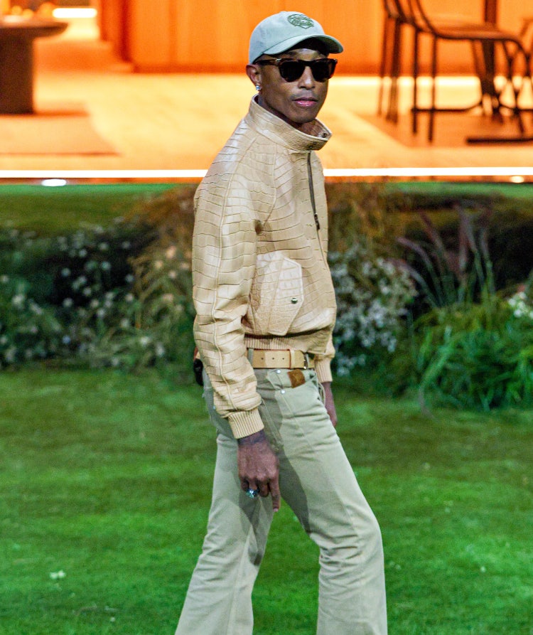 For this year’s Louis Vuitton menswear show, Pharrell stepped onto the runway in light, earthy tones (including flared trousers and a cap), then punched it up with a reflective snakeskin-style jacket that caught the light beautifully. It reads “Paris” because it’s playful, specific, and fully committed. And, of course, it’s Pharrell in style.