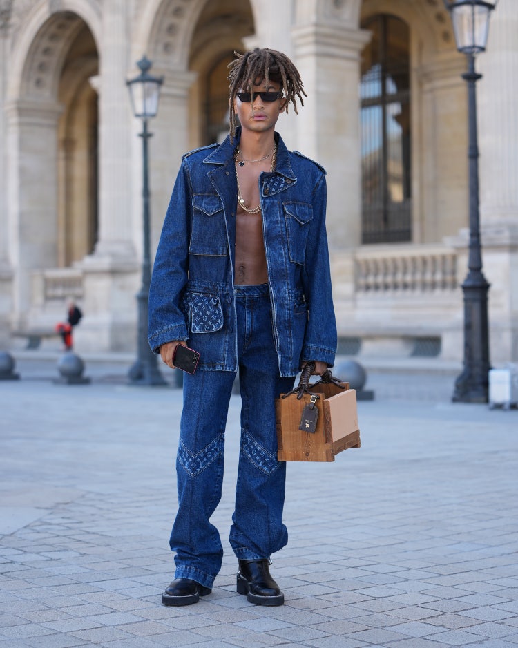 Jaden blurred streetwear and luxury in full Louis Vuitton denim. The oversized jacket brought utilitarian pockets and subtle LV monogram detailing, while the matching jeans echoed the same patterned patchwork. It was clean, coordinated, and impossible to ignore as a head-to-toe statement.