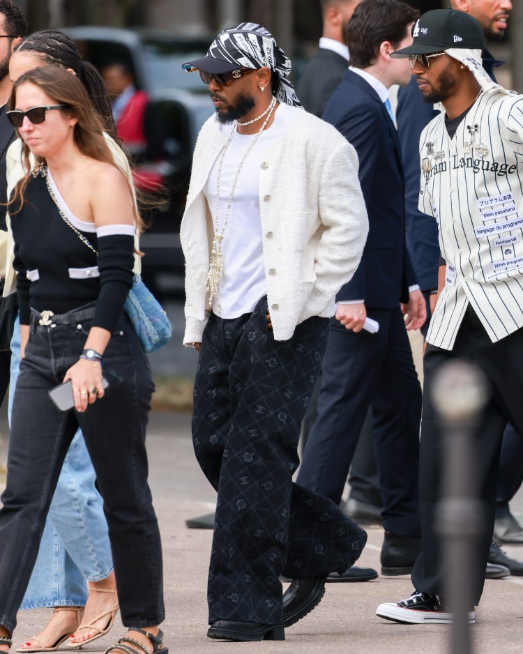 Kendrick kept it brand-pure: head-to-toe Chanel, down to the accessories. A Chanel bandana sat under a Chanel dad cap, paired with Chanel eyewear, a tweed jacket, and a pearl necklace looped short for a tighter hit of shine—then monogrammed jeans to close the look.
