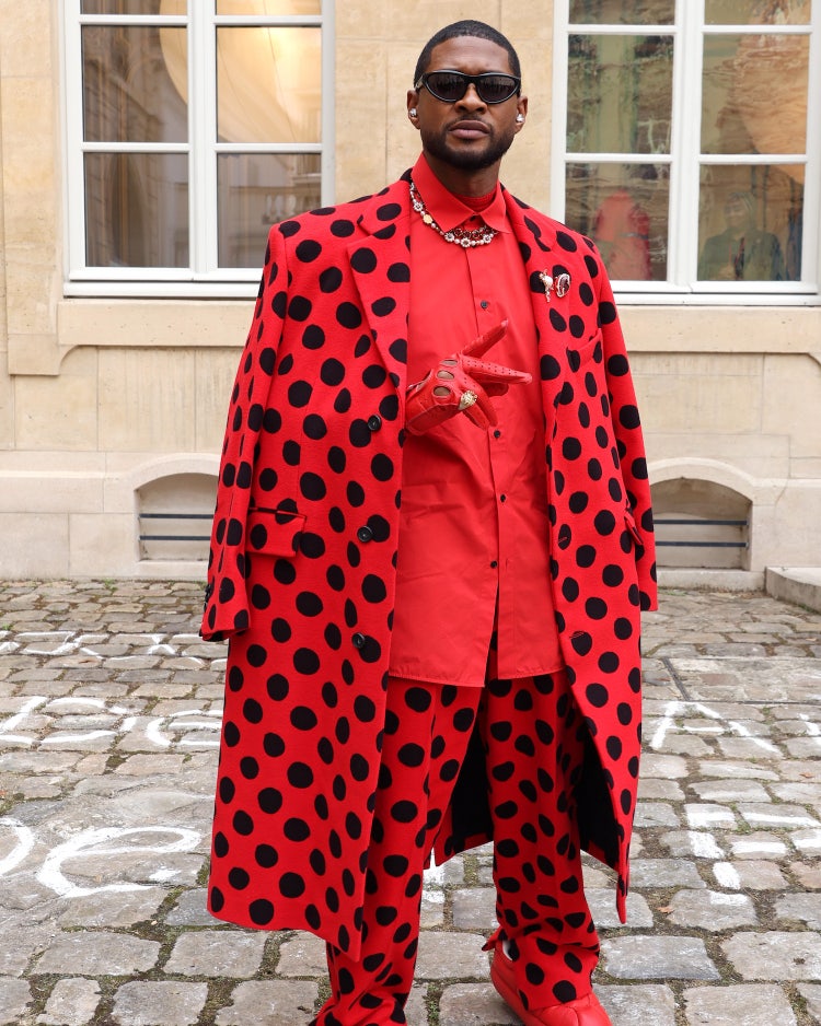 Usher went bold in Marni: a red polka-dotted topcoat and trousers, matched with overstuffed shoes, a shirt, and driving gloves in the same crimson lane. He topped it off with brooches, gem-set necklaces, oversized diamond earrings, and black sunglasses—maximalism that still felt tailored.