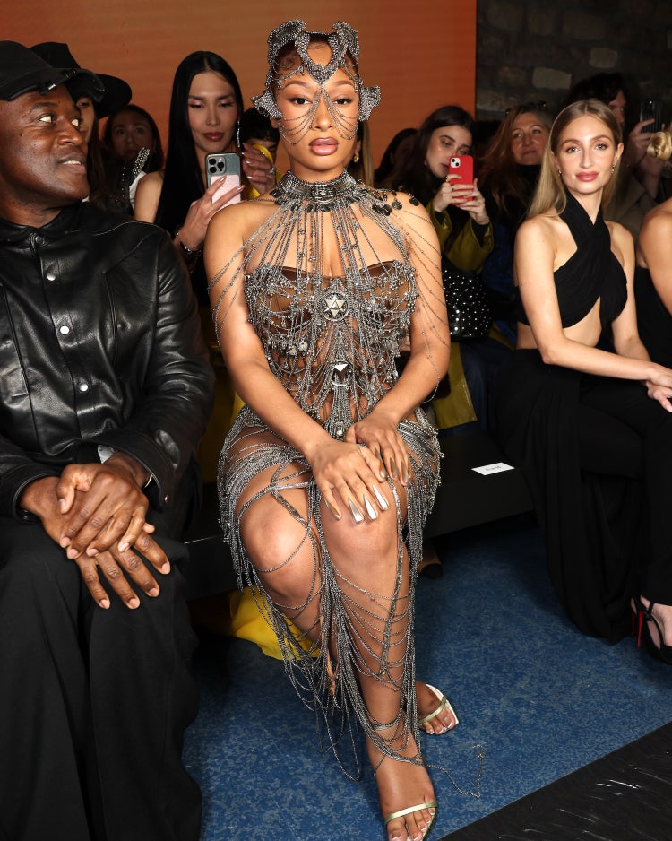 Megan brought full goddess energy in an intricate chain gown: cascading strands of chains, beads, and coins flowing from a statement choker, layered over a structured brown strapless corset bodysuit. She added a matching headpiece (with Object & Dawn) and square-toe strappy sandals for a clean finish.