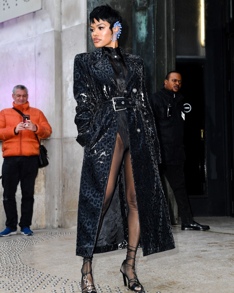 Teyana proved the power of a locked-in palette. She hit Mugler in a black ankle-length coat over black stockings and a black bodysuit that was clean, sharp, and intensely Mugler in spirit. When it comes to styling discipline, she allows no distractions; just silhouette and attitude.