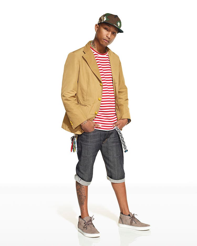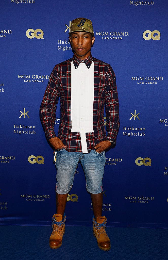 By 2013, knowing how to balance polish and personality came easily. As a mentor on “Styled to Rock” season one, Pharrell paired a camo Billionaire Boys Club cap with a striped tee, cuffed denim shorts, and lace-up boots, topped with a clean blazer. The look felt put-together without losing his sense of self.