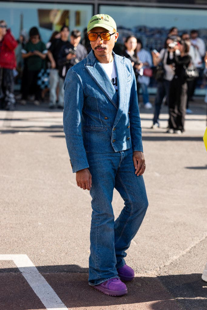 A denim-on-denim moment set the tone outside the Sacai show during Paris Fashion Week in 2023. Pharrell paired the suit with a graphic tee, bright purple sneakers, tinted glasses, and a baseball cap, letting the mustache add some personality.