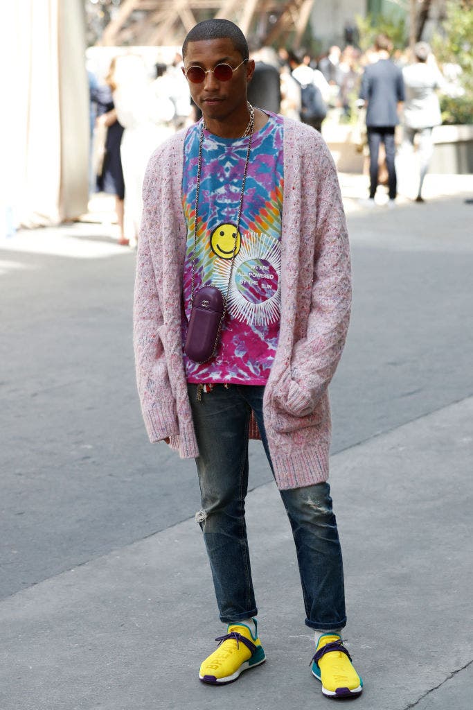 Ease took center stage at Chanel’s Fall/Winter 2017/18 Haute Couture show in Paris. Pharrell layered a soft pink cardigan over a graphic tie-dye tee with worn-in denim, bright sneakers, and a small chain-strap bag, letting color and comfort set the tone.