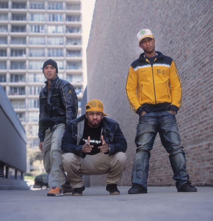 By 2002, N.E.R.D.’s visual identity was already clear. Pharrell appeared alongside his then group members Chad Hugo and Shay Haley in a track jacket, baggy denim, and a baseball cap, reflecting the group’s understated, unified approach to style and sound.