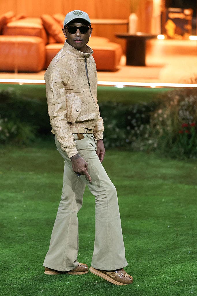 The close-out moment felt calm and confident at Pharrell’s Louis Vuitton menswear show in Paris in 2026. He stepped out in a snakeskin-textured jacket, flared trousers, matching sneakers, and a baseball cap, subtly spotlighting the craftsmanship as he acknowledged the applause for his collection.