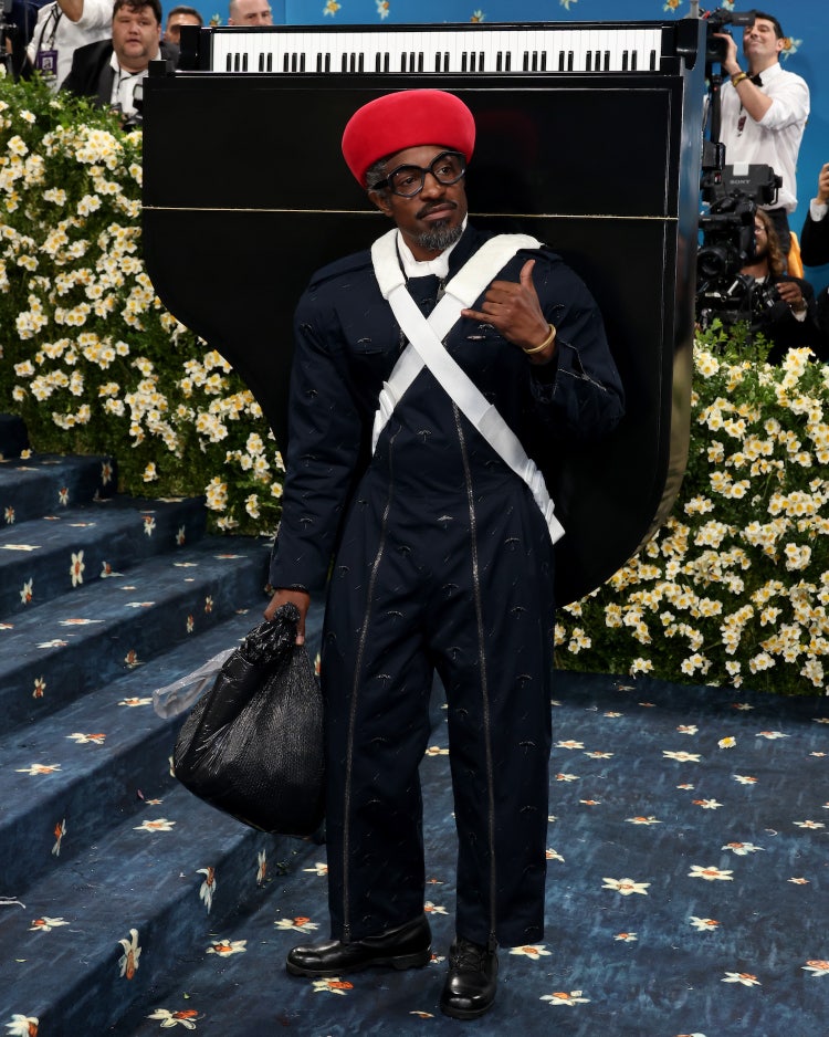 Perhaps this shouldn’t have been unexpected, but André 3000 surprised everyone when he floated in with a piano on his back. Styled by Law Roach, the OutKast legend wore a custom Burberry jumpsuit and red hat, but the centerpiece was a 30-pound replica of a Steinway Model S strapped across his shoulders — equal parts performance art and fashion statement. Speaking to GQ, Roach confirmed that the whimsical, bold and completely off-script idea came from 3 Stacks himself.