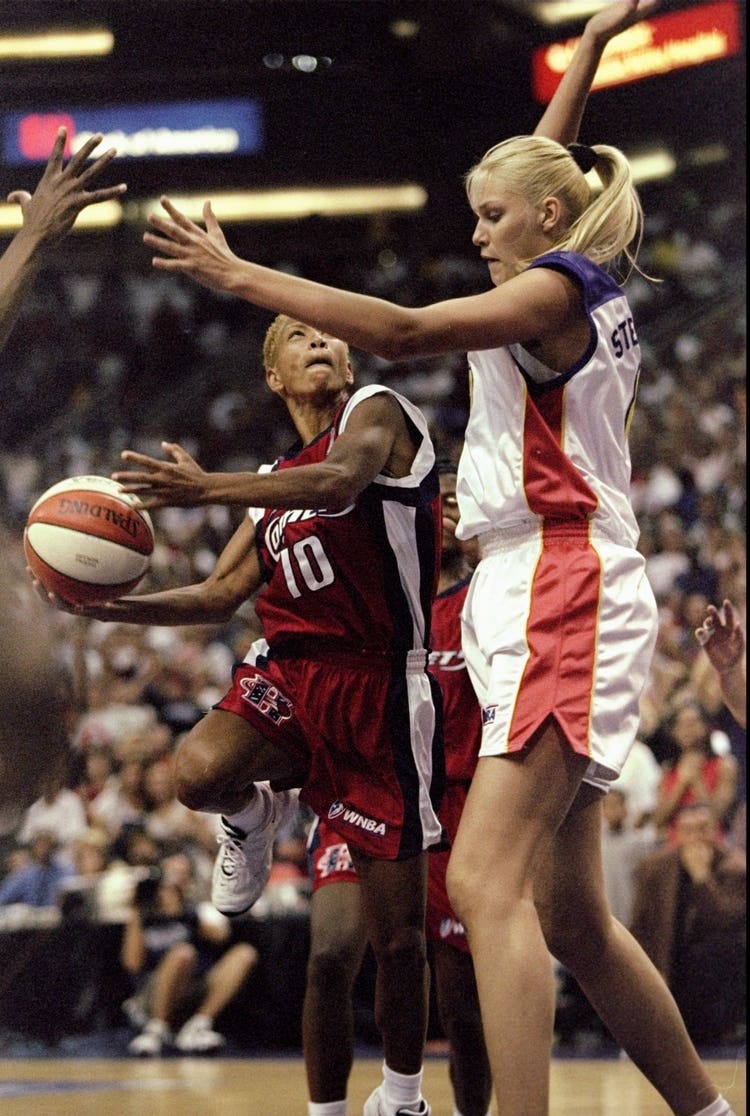 Right up there with the original tall girls in league history, Kara Wolters picked up the nickname “Big Girl” and wore it with pride. Which, at 6'7", what else were they gonna call her? Wolters won a title with the Houston Comets in 1999 before being inducted into the Women's Basketball Hall of Fame.